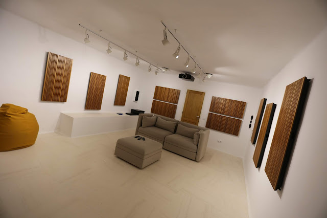 Malgré ces contraintes acoustiques, le client désirait une prestation chaleureuse et privilégiait les enceintes au mur.